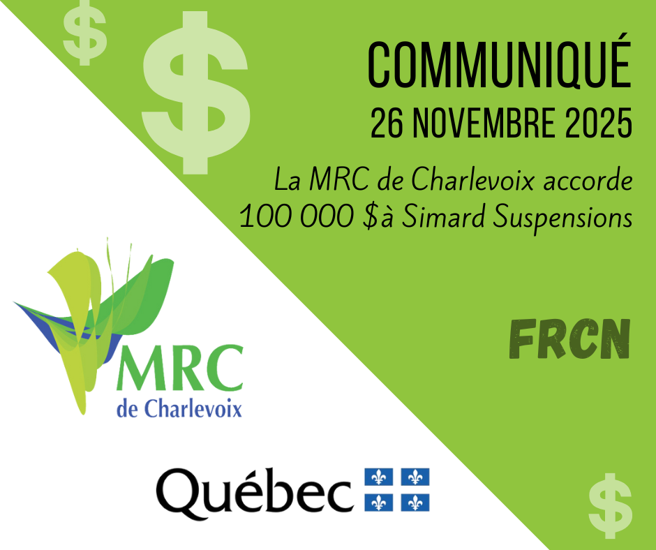 Le Conseil de la MRC de Charlevoix accorde une aide financière de 100 000 $ à Simard Suspensions Inc. avec le Fonds de la région de la Capitale-Nationale.