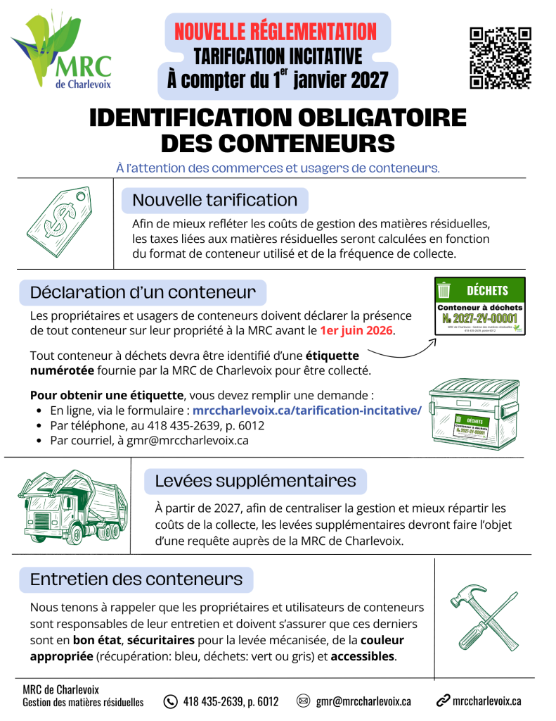 Tout conteneur à déchets devra être identifié d’une étiquette numérotée fournie par la MRC de Charlevoix pour être collecté. Les propriétaires et usagers de conteneurs doivent déclarer la présence de tout conteneur sur leur propriété en complétant ce le formulaire ci-dessous avant le 1er juin 2026: