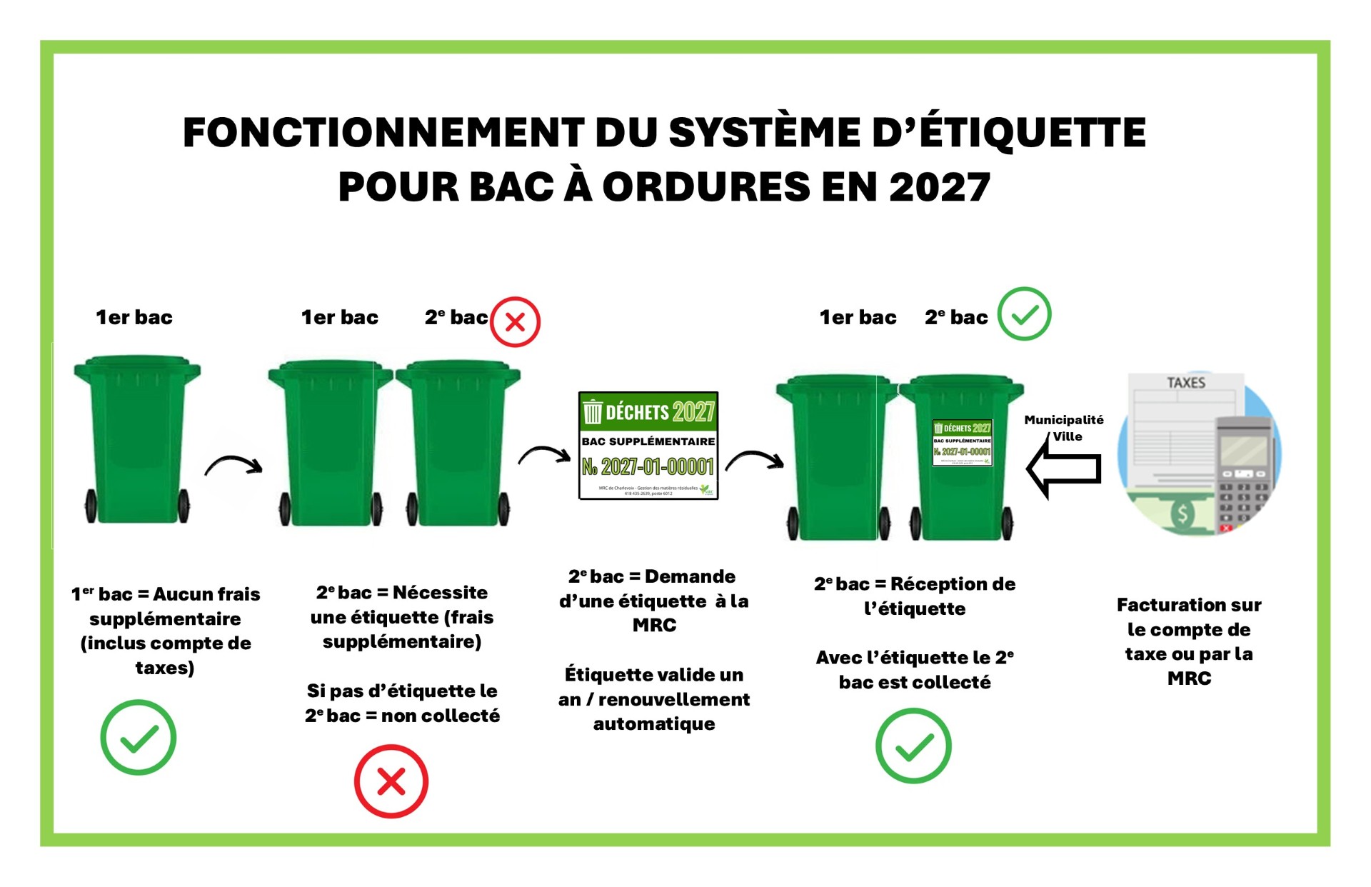 Pour vous en procurer une, vous devez obligatoirement compléter le formulaire ci-dessous d’ici le 1er juin 2026: Formulaire – Demande d’étiquette(s) pour un ou des bacs à ordures supplémentaire(s)